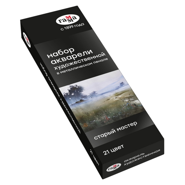 Профессиональная художественная акварель «ГАММА» серии «Старый мастер» разработана в собственной исследовательской лаборатории завода. Профессиональные краски состоят из тонкодисперсных пигментов, связующего, в состав которого входит раствор растительного клея - гуммиарабика высшей степени очистки, что обеспечивает насыщенность цветов, чистоту и прозрачность красочного слоя. Акварель «Старый мастер» изготавливается без использования дополнительных наполнителей, а многослойная заливка увеличивает долю пигмента. Краски обладают высоким уровнем светостойкости. С помощью акварельных красок «ГАММА» серии «Старый мастер» можно писать в различных техниках, например, - лессировка, по - мокрому, заливка, сухая кисть. Набор представлен в металлическом пенале с удобными креплениями кювет, палитрой и кольцом-держателем на обратной стороне. Такой формат удобен для пленэра или студии. Иллюстрация для упаковки предоставлена Ильей Ибряевым.