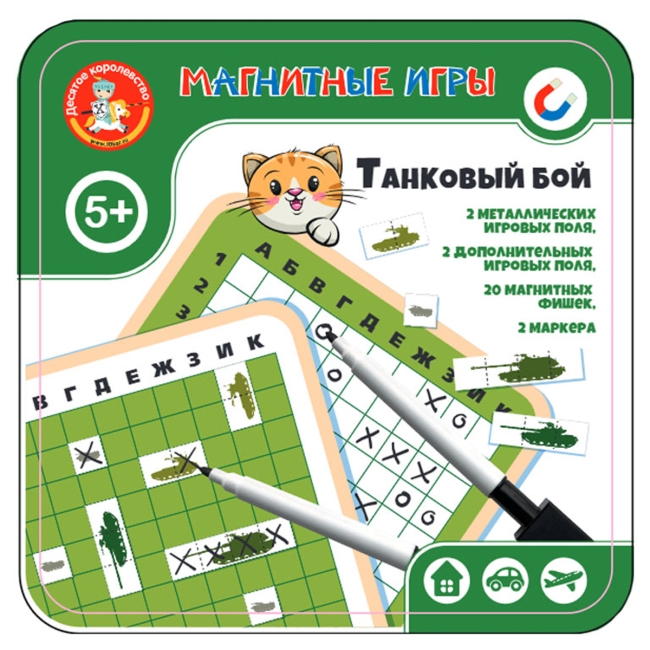 Игра магнитная в жестяной коробочке "Танковый бой". Состав игры: жестяная коробочка с игровыми полям (15х15 см) - 1 шт, дополнительные игровые поля - 2 шт, маркеры - 2шт, магнитные фишки - 20 шт. Материалы: металл, полимерный материал, картон, маркер. Для детей старше 5 лет.