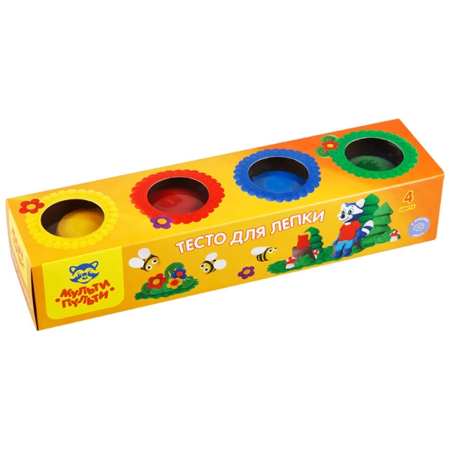 Набор теста для лепки «Мульти-Пульти» серия «Енот на пасеке» из четырёх ярких цветов: красный, жёлтый, синий, зелёный. Каждый цвет упакован в индивидуальный пластиковый стакан, который не позволяет тесту высыхать. Вес теста в одной баночке – 90 г. Все цвета хранятся в удобной картонной коробке. Работа с тестом для лепки «Мульти-Пульти» развивает и тренирует мелкую моторику рук ребенка, положительно влияет на его эмоциональное состояние. Цвета легко смешиваются и не пачкают руки. Тесто для лепки Мульти-Пульти сертифицировано для детей от 1 года.