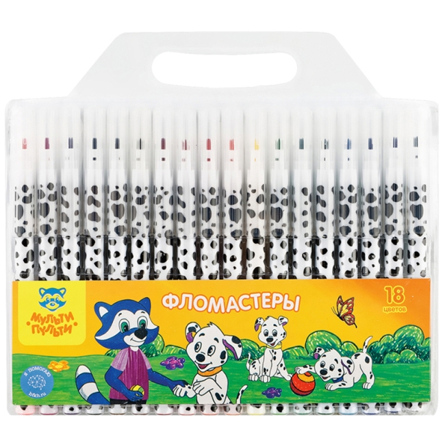 Фломастеры «Мульти-Пульти» серии «Енот и далматинцы» представлены с легкосмываемыми чернилами и вентилируемым колпачком. Толщина линии письма составляет 2 мм, а длина линии письма – не менее 310 метров. В наборе 18 ярких цветов. Корпус круглой формы изготовлен из пластика и имеет удобную круглую форму захвата. На белых корпусах фломастеров нанесен оригинальный рисунок, который привлекает дополнительное внимание к продукции. Тип наконечника – конический. Фломастеры сохраняют стабильный цвет при письме на протяжении всего использования. Смываемые фломастеры на водной основе нетоксичны. Набор фломастеров упакован в блистер с европодвесом. • Количество цветов: 18, • Тип наконечника: конический, • Длина линии письма: 310 метров.