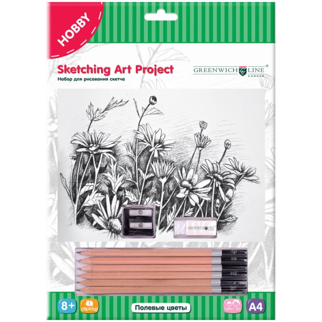 Набор для рисования скетча Greenwich Line "Полевые цветы", A4, карандаши, ластик, точилка, картон