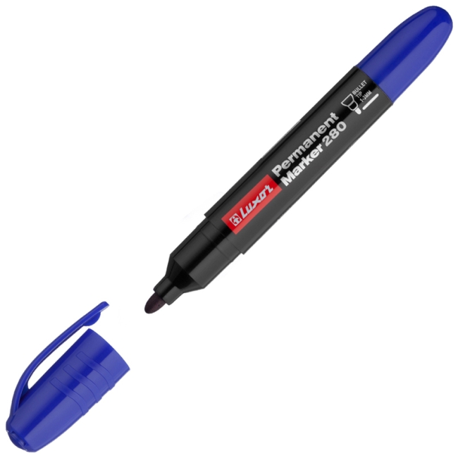 Перманентный маркер Luxor "280" с увеличенной зоной захвата предназначен для использования на всех типах поверхностей: доска, пластмасса, стекло, керамика, металл. Увеличенный запас чернил, пишет в два раза дольше стандартных перманентных маркеров. Чернила на спиртовой основе без ксилола и толуола обладают устойчивостью к различным неблагоприятным внешним факторам, таким как влага, солнечный свет, перепад температуры, поэтому чернила быстро высыхают и не стираются. Увеличенный диаметр корпуса. Круглая форма наконечника. Ширина линии письма 1-3 мм. Цвет чернил - черный. Длина линии письма – 900 метров. Цвет чернил - синий.