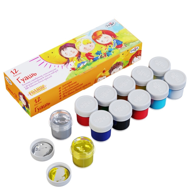 Необычный набор гуаши станет прекрасным подарком ребенку, для которого творчество — это хобби. В наборе 9 традиционных, золотой и серебряный цвета, две баночки белил. Плотная, укрывистая текстура гуаши равномерно ложится на любую поверхность и не деформирует бумагу.