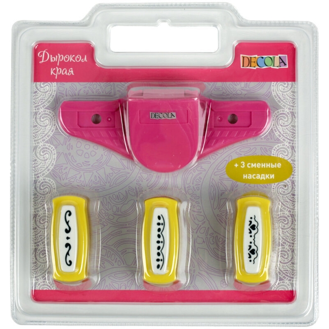 Дырокол края со сменными насадками предназначен для резки непрерывного узора по краю бумаги. Применяется при оформлении подарков, декорировании открыток, пригласительных, фотоальбомов. Поместите лист бумаги в прорезь дырокола и нажмите на кнопку. Рекомендуется использовать в работе бумагу плотностью до 200 г/м?. Следует регулярно смазывать лезвия дырокола и производить их своевременную заточку, прокомпостировав, фольгу или мелкую наждачную бумагу. Состав набора: дырокол (1 шт.) + сменные насадки с вырубкой 4,5х1 см (3 шт.).